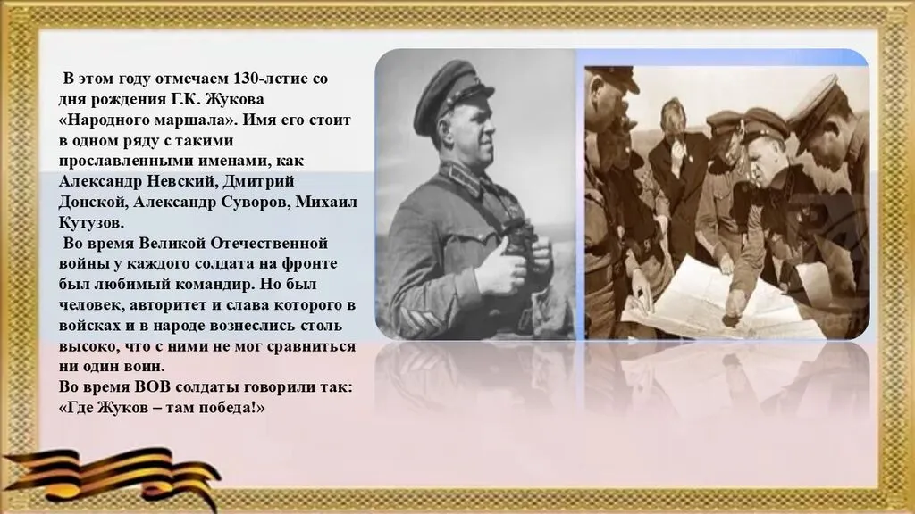 В жизни и военной карьере Г.К.Жукова было всё: блестящие победы и горькие поражения, триумфы и падения. Но во всём проявлялся его характер, несгибаемая воля и мужество. Не случайно его имя стоит в ряду полководцев, спасителей Отечества в самые трудные времена, таких как Александр Невский, Кузьма Минин, Дмитрий Пожарский, Дмитрий Донской, Александр Суворов, Михаил Кутузов.